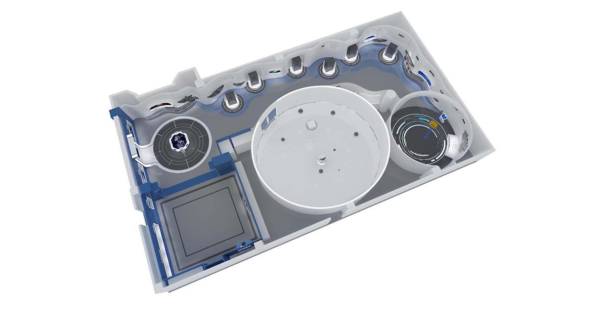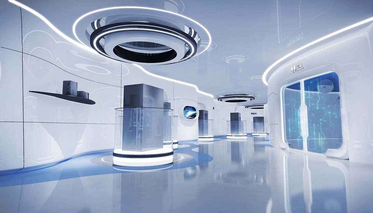 展廳設計策劃思路:以航天五院503所企業文化、產品特性、服務范圍作為設計出發點,以航空,衛星軌跡造型為基礎,提煉其中創意進行轉化,結合展廳“航天之星,窺探蒼穹”的主題。體現展廳科技感,現代感的設計效果。