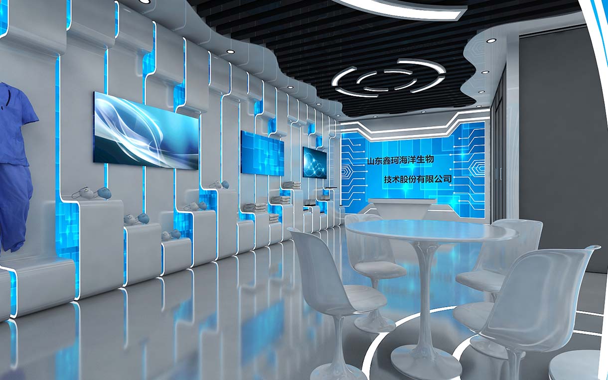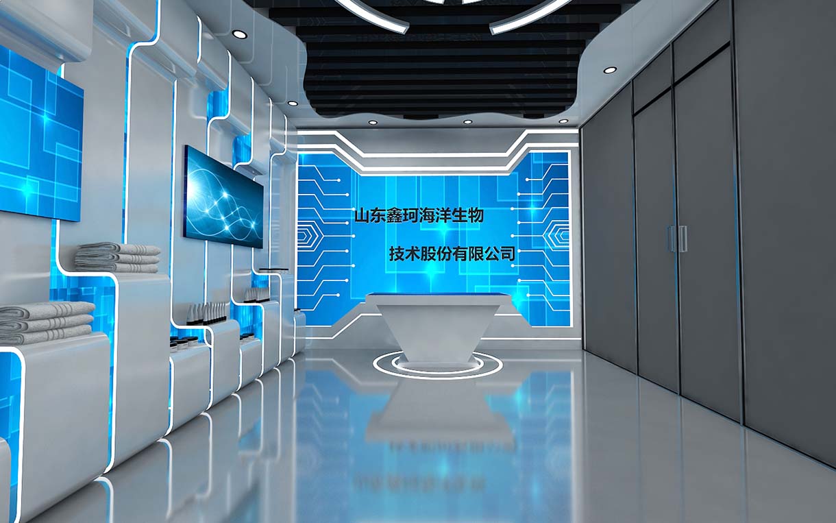 海洋占據地球面積的71%,是一座待開發的寶庫。本次設計將以“海洋”為元素,以藍色為主色調,強化山東鑫珂海洋生物科技有限公司定位,使參觀者在最短的時間內了解企業,了解產品。