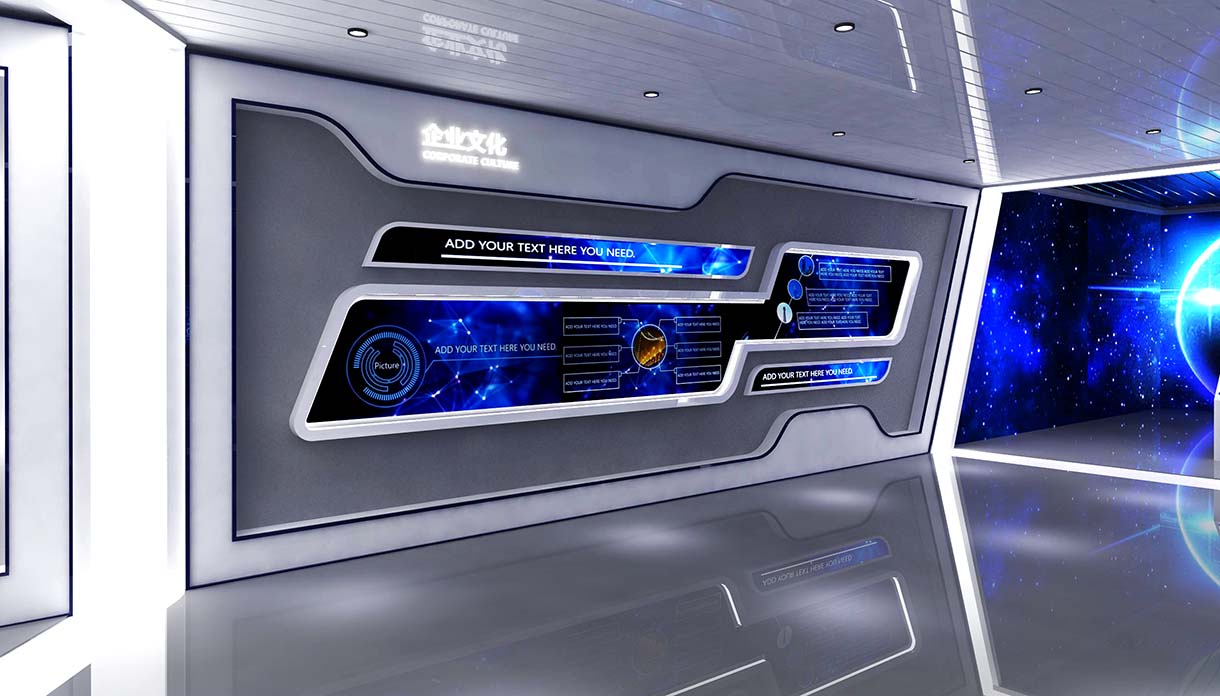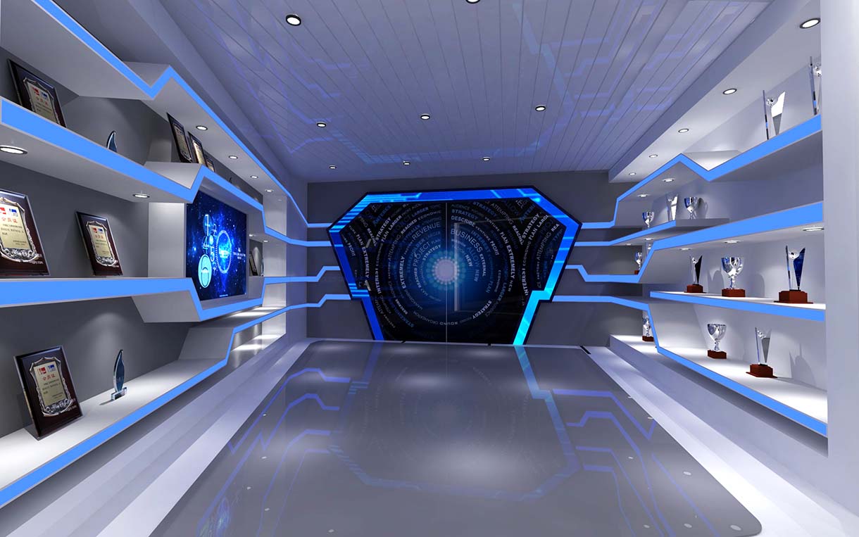 展廳設計策劃思路:展廳整體以白主作為主色調,配合企業LOGO顏色;地面、天花、墻面設置藝術造型,形成空間連貫性;以點、線構成平面,配合燈光線條,對整體空間進行引導和延伸,營造科技、大氣的視覺感受。